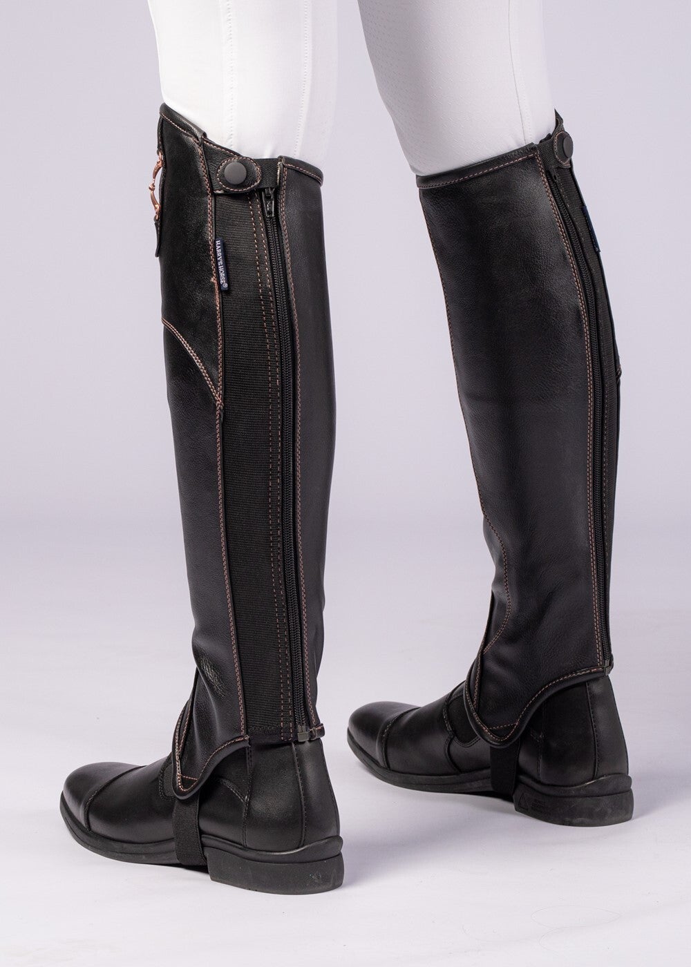 Luxe en soepele minichap met een elastisch kuitgedeelte. Uitgevoerd met een rosegold bit op de zijkant en stiksels in het rosegold. Vervaardigd uit Microtouch PU leather